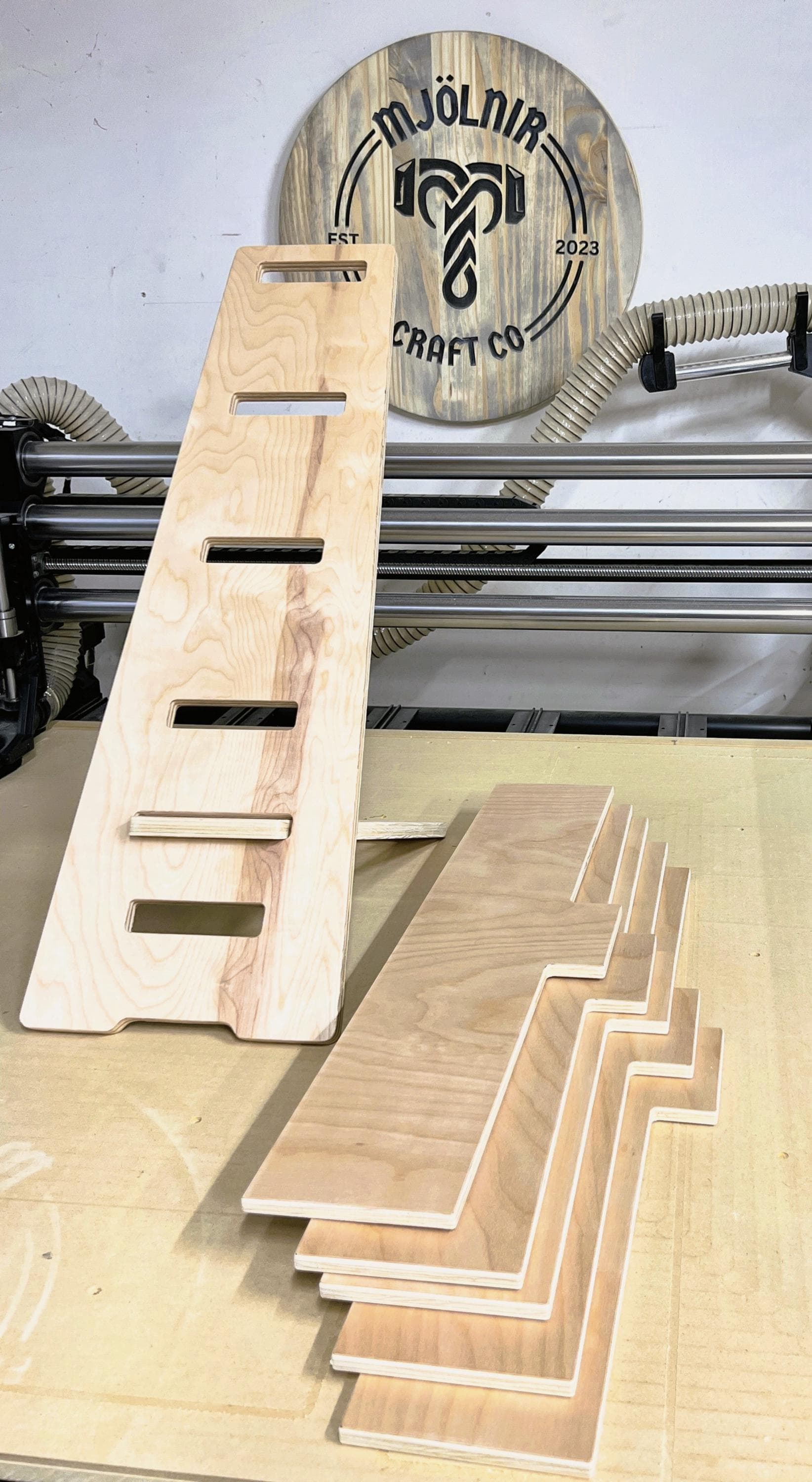 After many requests, we have expanded our shelves to include the Kelsie 5x6, a portable, collapsible, and adjustable 5-tier wood display shelf built around our Kelsie 4x6 design. Ideal for craft shows, market fairs, or vendor events. Crafted from durable plywood, choose between a minimally processed unfinished version (round overed edges only) or a clear satin polyurethane finish, each adding a rustic charm to your setup.